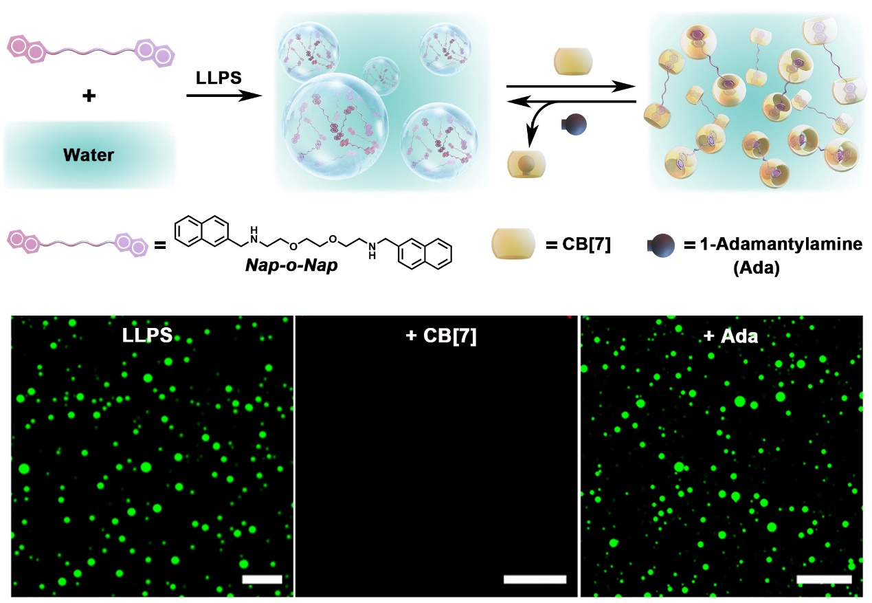 近日,北京理工大学化学与化工学院高宁教授和北京大学黄泽寰研究员合作,通过提取IDPs的关键结构特征,设计合成了一种具备发生液-液相分离能力的小分子:Nap-o-Nap。如下图所示,该化合物由两个萘环和一个乙二醇衍生物连接而成,在生理条件下可以发生类似IDPs的液-液相分离。更为关键的是,该小分子的液-液相分离行为可以通过定量加入葫芦[7]脲和金刚烷铵盐酸盐来实现超分子可逆调控。