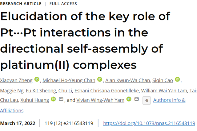 相关研究成果以“Elucidation of the key role of Pt…Pt interactions in the directional self-assembly of platinum(II) complexes”为题,2022年3月发表在国际顶级期刊《Proceeding of the National Academy of Sciences, PNAS》上 (2022, 119 (12) e2116543119). 北理工化学与化工学院李泽生教授团队的郑小燕副研究员为该论文的第一作者,香港科技大学黄旭辉教授和香港大学任咏华院士为通讯作者,北京理工大学为第一通讯单位。该研究工作得到了国家自然科学基金面上项目(22173006)和北京市自然科学基金面上项目(2222027)的资助。该文章于2021年9月投稿,黄旭辉课题组当前地址为威斯康星大学。