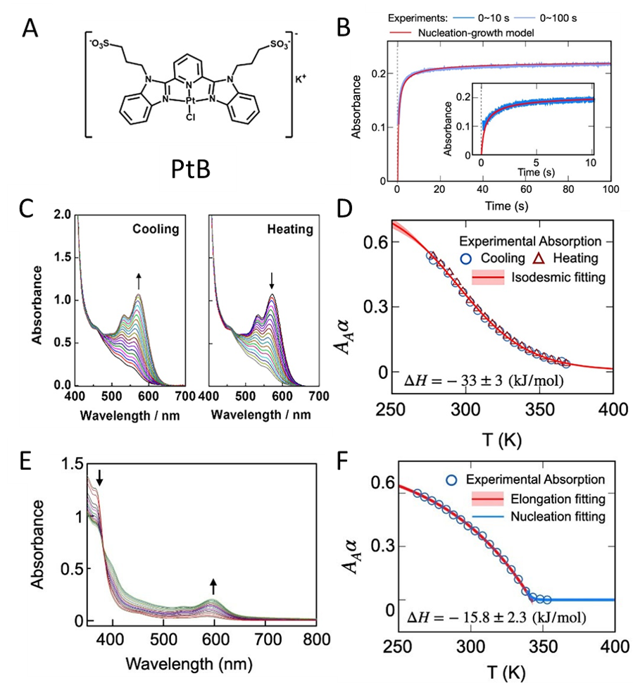 北京理工大学化学与化工学院李泽生教授团队的郑小燕副研究员、香港科技大学的黄旭辉教授和香港大学的任咏华院士合作对不同溶剂环境下两亲性Pt(II)配合物PtB的分子组装机制进行了系统的研究。由于分子间Pt···Pt相互作用会产生新的光谱信号,通过变温紫外可见光谱可获取平衡态PtB的组装体相对于单体的比例(α)随温度的变化,作者分别通过等键模型(Isodesmic model)和成核增长模型(Nucleation-Elongation model)拟合不同溶剂下PtB的α-T曲线来探索其分子组装体生长机制。研究发现:在纯水溶液中,α-T曲线符合等键增长模型,所得平衡常数分别为Ke300K = 2.4×103 M-1和Ke368K = 2.6×102 M-1;在丙酮和水混合溶液中,α-T曲线符合成核增长模型,所得平衡常数为Ke298K = 2.6×103 M-1和Ke328K = 1.4×102 M-1。同时成核过程对应的平衡常数为5.0×10-6。此外,作者通过Stopped-flow吸收光谱实验测定了PtB在丙酮和水混合溶液中的组装过程动力学。结果发现,实验数据符合成核增长模型:在t=0.1s时,PtB具有1.1×10-6 M s-1的成核速率,随后成核速率急剧下降直至1.0 s时几乎可忽略不计。在t=0.1s时,PtB的生长速率为10.6 s-1,随着PtB单体被消耗和分子组装体间的融合,其生长速率逐渐降低。这一结果表明PtB在丙酮和水混合物溶液中的组装过程符合成核增长形成机制。