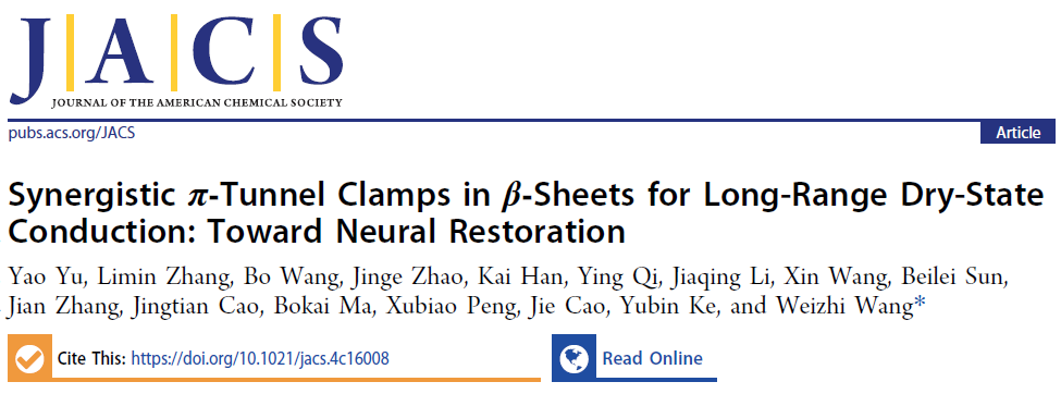 近日,北京理工大学化学与化工学院王蔚芝课题组在靶向多肽识别与化学传感测量方面取得重要进展。通过分子设计构建了全天然氨基酸组成的β-折叠靶向多肽电子传输通道,在高选择性识别的同时实现了干态导电和信号传输,并成功应用于神经电信号传导及损伤修复。这一突破为开发基于精准化学测量新方法的生物电子接口和神经再生技术开辟了全新路径(图1)。相关研究成果以“Synergistic π‑Tunnel Clamps in β‑Sheets for Long-Range Dry-State Conduction: Toward Neural Restoration”为题发表于国际顶级期刊《Journal of the American Chemical Society》。北京理工大学为第一通讯单位,王蔚芝教授为论文通讯作者,化学与化工学院2021级硕士生于姚(已毕业,现就职于中国一汽)为论文第一作者。此项研究得到了国家自然科学基金,北京市自然科学基金等项目的资助及北京理工大学分析测试中心的支持。中国散裂中子源柯于斌研究员在小角中子散射测试方面给予了大力支持,北京理工大学物理学院彭绪彪老师在β折叠分子动力学方面给予了大力支持,香港大学张黎民博士在多肽组装机理解析方面给予了大力支持,北京理工大学曹洁老师在高分辨质谱测序方面给予了大力支持。