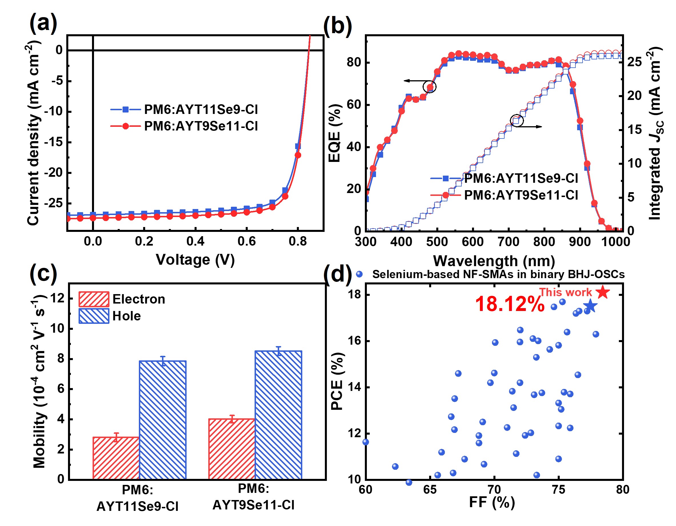 单晶堆积模型分析表明,与AYT11Se9-Cl相比,硒吩β位上具有较长n-十一烷基链的AYT9Se11-Cl形成了更紧密和有序的分子间堆积,因而具有额外的非共价相互作用。尽管这些双不对称异构体在纯膜中具有相似的吸收和HOMO/LUMO能级,但AYT9Se11-Cl在纯膜表现出更有效的电荷传输行为以及更高的电子迁移率。此外,与PM6:AYT11Se9Cl相比,PM6:AYT9Se11-Cl共混膜具有更强的结晶度和更明细的结晶取向以及更合适的相分离形貌特征,这与增加的电子-空穴迁移率以及抑制的电荷复合有关。因此,基于PM6:AYT9Se11-Cl的器件实现了18.12%的最优光电转换效率,明显高于基于PM6:AYT11Se9-Cl的器件结果(17.52%),是目前基于硒取代受体本体异质结型二元有机太阳能电池器件的最高值之一。综上,这项工作证明,基于不对称硒吩以及外部不对称烷基链的区域异构是一种协同和实用的方法用于开发高性能SMAs,不仅可以调节分子间聚集、晶体填充和混合膜形态,而且能进一步提高相应OSCs器件性能。