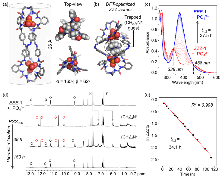 四面体硫酸根(SO₄²⁻)和磷酸根(PO₄³⁻)阴离子与三足六脲骨架全反式(EEE)分子笼的空腔结构高度互补,通过晶体结构、核磁、质谱等证实分子笼能够与硫酸根、磷酸根离子形成1:2的高度螺旋状的配位构象。理论计算和核磁实验证实:全顺式分子笼在保持阴离子配位的同时可封装TMA+阳离子,进而提高了全顺式ZZZ异构体的稳定性;相比于EZZEEZ两个中间异构体,ZZZ异构体的吉布斯自由能明显降低。核磁和紫外动力学跟踪实验表明,硫酸根、磷酸根离子配位分子笼表现为缓慢、一步式异构化行为(图2,热弛豫半衰期为34.1小时)。