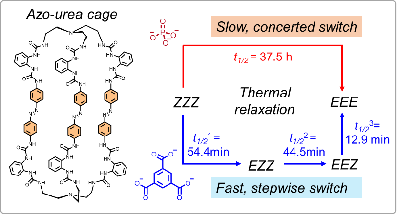 偶氮苯作为一类研究光开关的明星分子,具有顺式(E)-反式(Z)光异构效率高、合成易修饰等特点,被广泛用于智能响应型超分子体系和功能材料,在能源、催化、医药等领域呈现出优异的应用前景。单个偶氮苯的顺-反异构化行为能够很好地控制组装系统的结构和性质变化,但是对于复杂的多个偶氮光开关体系,其光异构化行为的精准调控和光异构化机理的认知存在着极大的挑战。近年来,吴彪教授团队聚焦于光响应型阴离子配位体系的异构化行为和调控方法研究,并取得系列研究进展。前期研究发现:磷酸根配位能够驱动线性偶氮苯双二脲配体组装形成四面体/三螺旋结构,实现了组装体结构的光可逆控制和限域环境中的客体结合-释放的调控(Angew. Chem. Int. Ed. 2022, 61, e202201789);首次实验验证了三螺旋结构的原位光异构化机理(Angew. Chem. Int. Ed. 2023, 62, e202314510)。通过系统对比Cl⁻/SO₄²⁻/PO₄³⁻诱导的单/双/三螺旋结构的热弛豫行为揭示了阴离子配位的调控规律(Sci. Sin. Chim. 2023, 53, 2568)。在此基础上,研究团队提出了“共价键空间强化”的策略,设计合成了三偶氮苯类多脲分子笼分子,利用多脲基元独特的氢键结合能力,通过阴离子配位作用首次实现了三偶氮光开关体系的异构化行为调控。