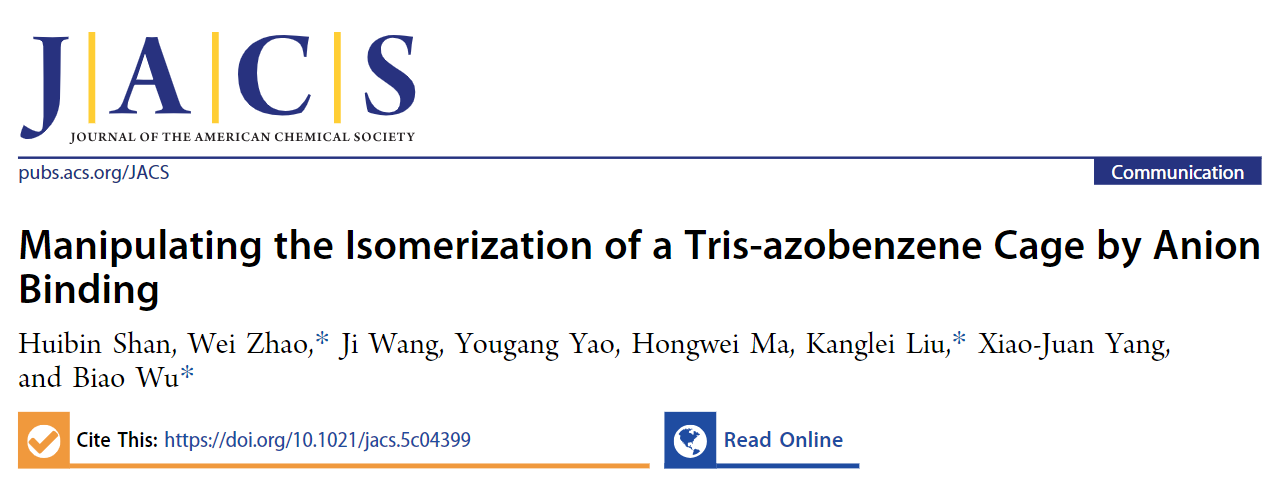 近日,北京理工大学化学与化工学院吴彪、赵伟、刘康蕾研究团队在阴离子配位作用调控多偶氮共价分子笼光异构化行为方面取得重要进展。基于前期阴离子配位驱动超分子自组装方面的研究成果(Acc. Chem. Res. 2022, 55, 3218−3229),研究团队设计合成了一种三偶氮苯型多脲共价分子笼。利用阴离子与多脲基元之间的阴离子配位作用,首次实现了单个多偶氮苯光开关系统一步式和分步式光异构转化行为的调控(图1),成功模拟了生命系统(如凝血级联反应)基于环境信号动态调控一步式和分步式免疫反应路径的行为。相关研究以“Manipulating the Isomerization of a Tris-azobenzene Cage by Anion Binding”为题发表于国际顶级期刊《Journal of the American Chemical Society》。赵伟副教授、刘康蕾副教授和吴彪教授为论文共同通讯作者,化学与化工学院2022级硕士研究生单惠彬为论文第一作者。该研究得到了国家自然科学基金、北京市自然科学基金等项目的资助;北京理工大学分析测试中心马宏伟老师在单晶结构解析方面给予了大力支持。