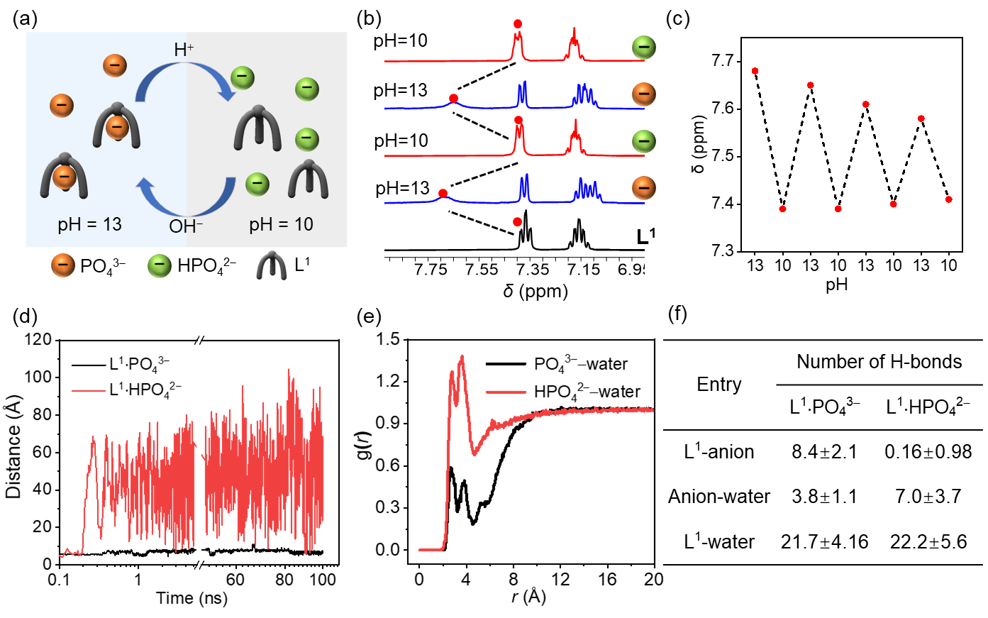 利用该配体对PO43-和HPO42-结合常数的巨大差异,通过调控pH,可以利用该配体实现磷酸盐的可逆结合和释放。分子动力学模拟L1·PO43-和L1·HPO42-的结构表明,在水溶液中PO43-与L1形成了平均8.4 ± 2.1个分子间氢键,而PO43-与水之间的氢键数目仅为3.8 ± 1.1。相反,HPO42-与L1之间几乎没有氢键(0.16 ± 0.98),而HPO42-与水之间则形成了7.0 ± 3.7个氢键。这些氢键模式表明,PO43-更倾向于通过氢键与L1配位,而HPO42-则更倾向于通过氢键与水配位。