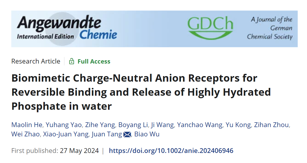 近日,北京理工大学化学与化工学院吴彪教授和唐娟特别研究员团队在仿生电中性阴离子受体与水中高水合磷酸盐的可逆结合和释放方面取得重要进展。相关成果以“Biomimetic Charge-Neutral Anion Receptors for Reversible Binding and Release of Highly Hydrated Phosphate in water”为题发表于国际顶级期刊《Angewandte Chemie International Edition》。北京理工大学为唯一通讯单位,吴彪教授和唐娟特别研究员为论文通讯作者,化学与化工学院硕士生何茂琳为第一作者。此项研究得到了国家自然科学基金,北京理工大学青年教师学术启动计划的资助及北京理工大学分析测试中心的支持,同时福州大学姚宇航老师在理论计算方面给予了大力支持。