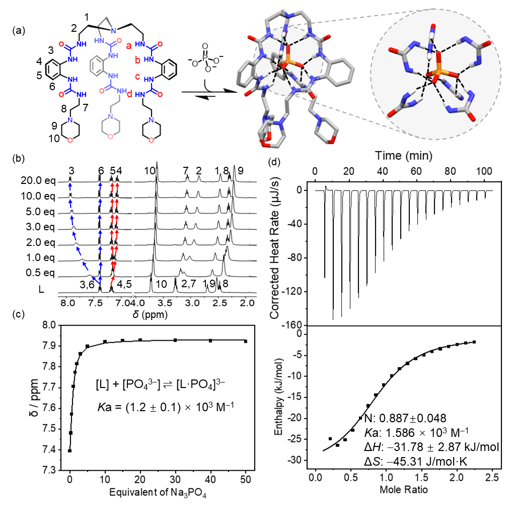目前,小分子在水中与磷酸盐的结合主要由带正电的有机配体和金属配合物主导。它们的结合主要依赖于非定向的静电相互作用或强金属配位,然而这会削弱这些结构对其他阴离子的选择性。通过氢键与阴离子结合的电中性阴离子配体虽具有选择性,但大多在有机溶液或有机-水混合物中发挥作用。目前尚未有报道能在水中结合高度水合的PO43-的中性阴离子受体。