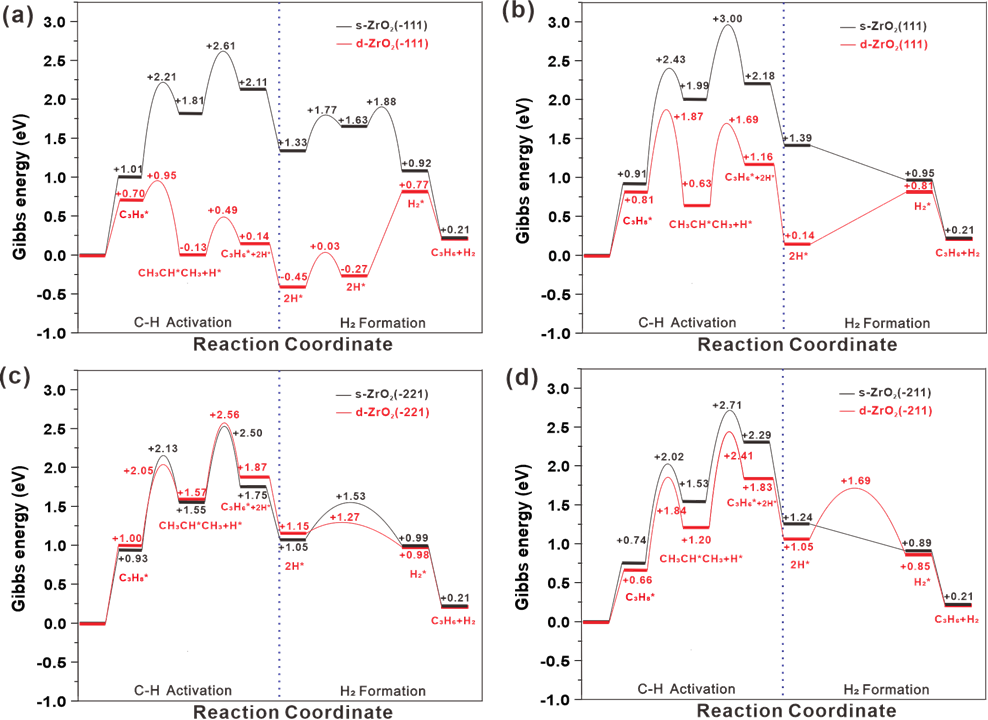 为了从分子水平上研究了上述四个晶面上PDH的反应机理和活性位点结构,构建了(-111)、(111)、(-211)和(-221)晶面的化学计量表面(s-ZrO2)和缺陷表面(d-ZrO2)结构。DFT计算表明,相比于其它晶面,d-ZrO2(-111)具有最高的本征活性。s-ZrO2(-111)表面第一个C−H键活化的位点是Zr6cI-O2c,活化能为1.20 eV。去掉二配位的O2c后,这个位点变成[Zr5cI, Zr6cII]-Ov,是d-ZrO2(-111)表面第一个C−H键的活化位点,活化能为(0.25 eV)。s-ZrO2(-111)表面和d-ZrO2(-111)表面第二个H原子均位于Zr6cⅢ和Zr6cI(缺陷表面为Zr5cI)的桥位上,活化能分别为0.80 eV 和0.62 eV(图2)。由此可以看出,ZrO2(-111)晶面上氧空位的生成可以显著降低C−H键断裂的活化能,且在(-111)和(111)等低指数面上,氧空位的形成会产生更强的Lewis酸碱对,有助于PDH活性的增加。而对于(-221)和(-211)晶面,台阶位处Zr原子的配位数低于氧空位处Zr原子的配位数,氧空位的形成对PDH活性的影响则很小。