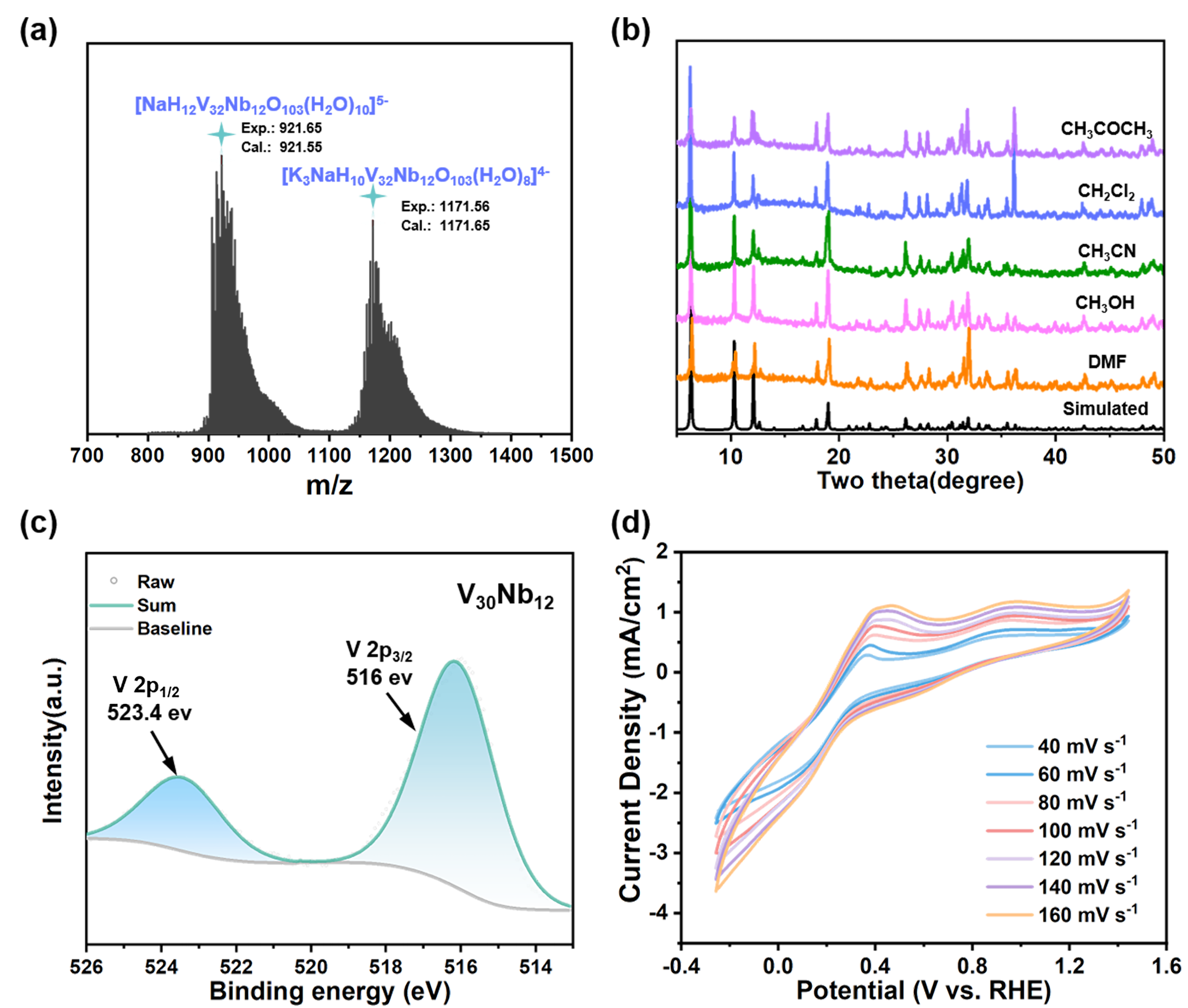 图4 V30Nb12的ESI-MS、浸泡稳定性、XPS及CV测试。