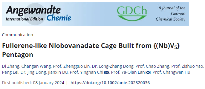 近期,北京理工大学化学与化工学院胡长文教授和迟瑛楠教授团队在基于{Nb(V5)}五角星的类富勒烯铌钒笼簇构筑方面取得重要进展。相关成果以“Fullerene-like Niobovanadete Cage Built from{Nb(V5)} Pentagon”为题,发表在化学领域国际顶级期刊《Angewandte Chemie International Edition》(2024, e202320036)上。北京理工大学化学与化工学院迟瑛楠教授和华南师范大学兰亚乾教授为共同通讯作者,北京理工大学为第一通讯单位,化学与化工学院博士研究生张迪为该论文的第一作者。