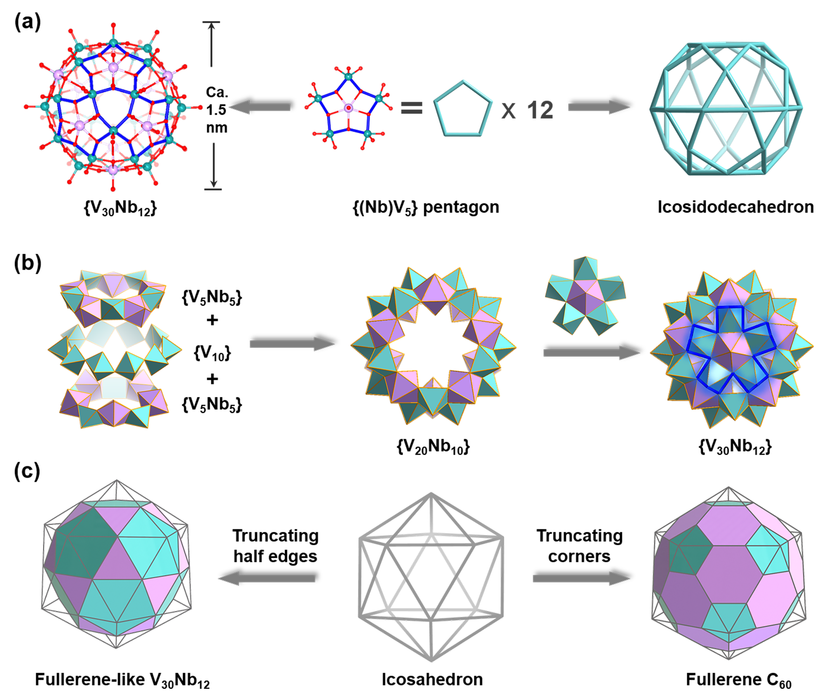 基于以上研究现状,胡长文教授和迟瑛楠教授团队首次在POV簇的合成中引入铌源,调控Nb、V两种原料的水解与聚合速率,利用铌源水解产生的{NbO7}诱导生成异金属{Nb(V5)}五角星构筑基元,制备了一例具有Ih对称性的纯无机类富勒烯POV笼簇:K11Na4H3{(V2O)V30Nb12O12 (H2O)12}·37H2O(V30Nb12)。该化合物由12个{Nb(V5)}五角星构筑基元通过与5个相邻的{Nb(V5)}五角星构筑基元共用V原子的方式连接而成。在类富勒烯V30Nb12中,30个V原子恰好位于截半二十面体的顶点上。从几何角度上看,V30Nb12所在的截半二十面体和富勒烯C60所在的截角二十面体可看作一对兄弟,两者都属于阿基米德固体,都通过正十二面体截边而形成。
