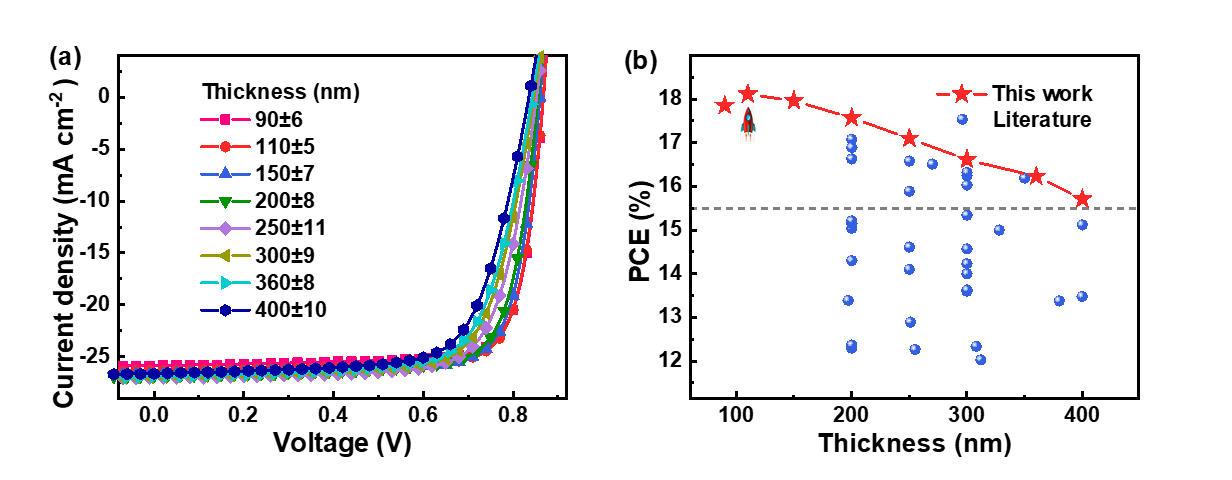 研究结果显示,当Y6-1O在受体中的含量为10 wt%时,三元器件最优效率达到18.11%,填充因子为79.27%。当器件的活性层厚度增加到300 nm或400 nm时,三元器件仍能保持16.61%或15.71%效率,均为目前已报道同厚度器件效率的最高值。三元器件效率的提升主要归因于更高效的电荷生成和提取过程,其得益于光子捕获的增加、能级及形貌的优化。该工作结果表明,将同源非富勒烯受体Y6-1O和Y7-BO相结合是同时实现高效薄膜和厚膜三元有机太阳能电池的一种有效策略。