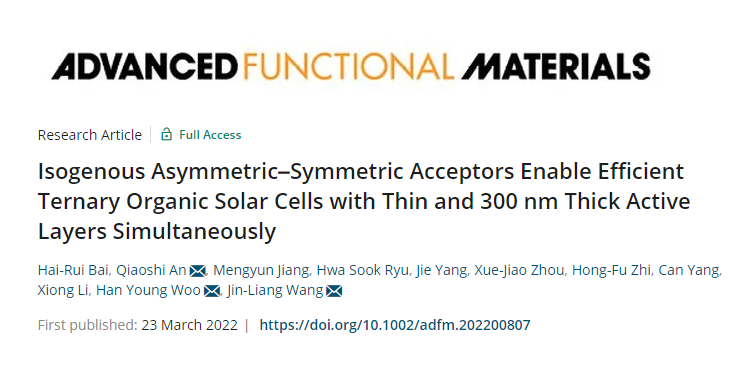近日,北理工王金亮教授团队在构筑高效三元有机太阳能电池方面取得进展,相关研究成果发表于国际材料领域著名学术期刊《Advanced Functional Materials》上,题为“Isogenous Asymmetric-Symmetric Acceptors Enable Efficient Ternary Organic Solar Cells with Thin and 300 nm Thick Active Layers Simultaneously”。化学与化工学院博士研究生白海瑞为论文第一作者,王金亮教授、安桥石特别研究员以及Han Young Woo教授(韩国高丽大学)为通讯作者,北京理工大学为第一通讯单位。论文的合作者还包括北京工商大学李熊教授。