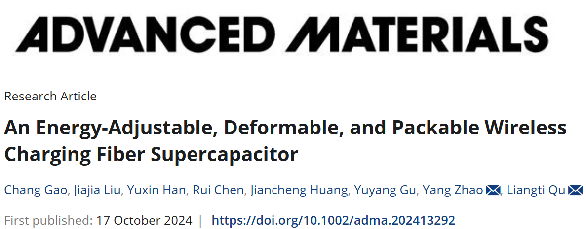 近日,北京理工大学化学与化工学院博士生高畅和硕士生刘佳佳为共同第一作者在国际顶级期刊《Advanced Materials》(IF: 32)发表题目为“An Energy-Adjustable, Deformable, and Packable Wireless Charging Fiber Supercapacitor”的研究论文(DOI:10.1002/adma.202413292)。北京理工大学为论文第一通讯单位,北京理工大学化学与化工学院赵扬特别研究员和清华大学曲良体教授为共同通讯作者。