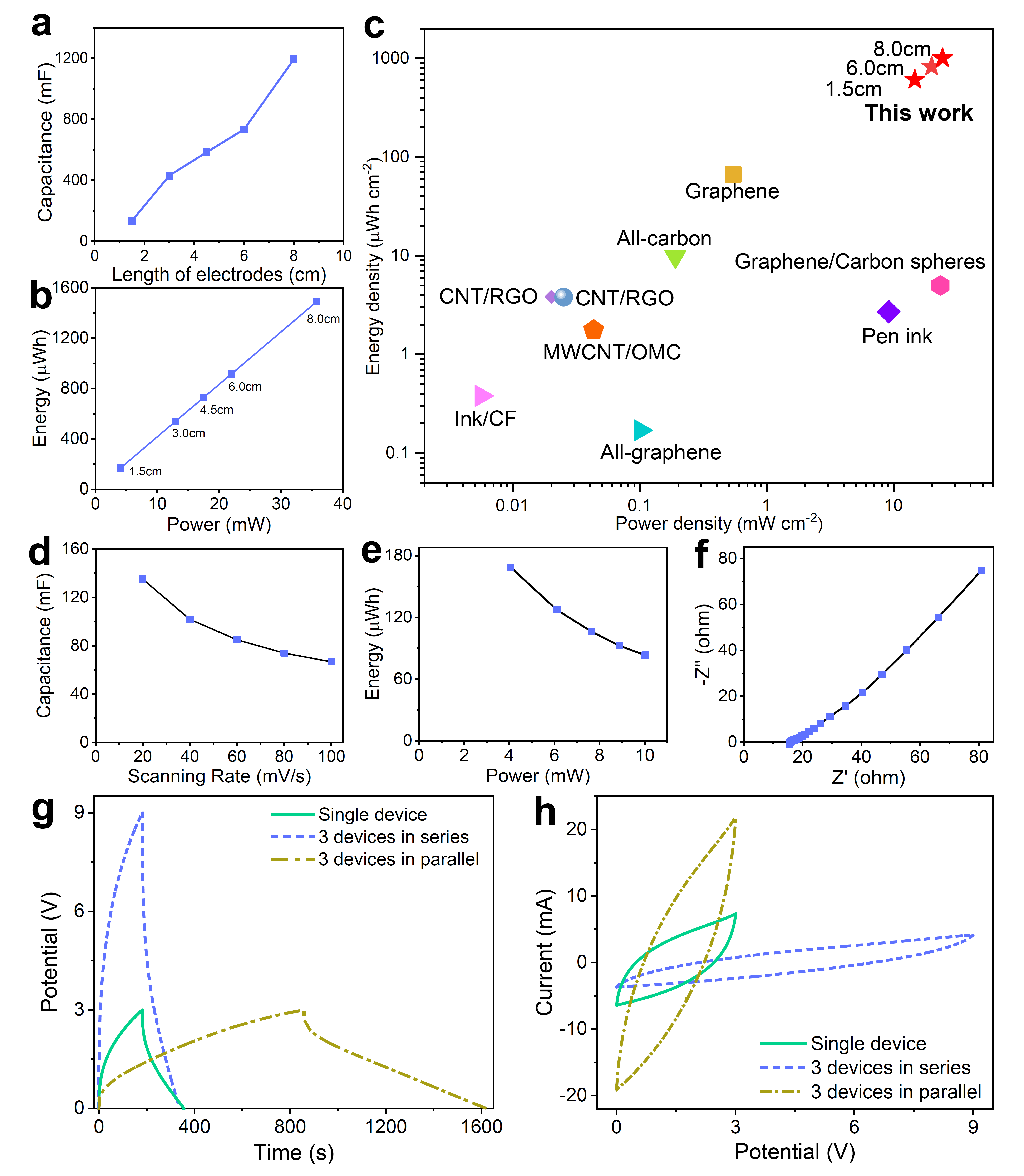 对不同电极长度(1.5~8.0 cm )的超级电容器进行电化学性能评价。电极长度从1.5 cm到8.0 cm,电容值从135 mF到1193 mF不等。计算得到的面积、质量和体积比电容值分别为803 mF cm -2、11.7 F g - 1和11.0 F cm -3。相应地,SC的能量和功率随着电极长度的增加而增加(图2b),当电极长度为8.0 cm时,SC的能量和功率分别达到最大值1490 μWh和35.8 mW。此外,SC可以很容易地进行串并联组装,以满足各种能源需求场景。图2g和2h展示了三个1.5 cm长的SCs串联和并联的恒流充放电(GCD)和循环伏安(CV)曲线,显示出SC优越的电化学性能。