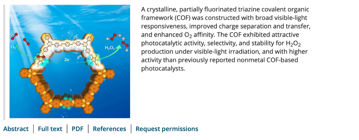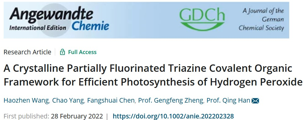 近日,北京理工大学的韩庆课题组提出了一种简单、高效的部分氟化的策略,构筑了高结晶性的亚胺键连接的三嗪基COF,显著增强其化学稳定性,实现高的电子传输效率,进一步研究了其在光催化氧气还原合成H2O2中的应用。文章的第一作者是北京理工大学的硕士研究生王浩桢。