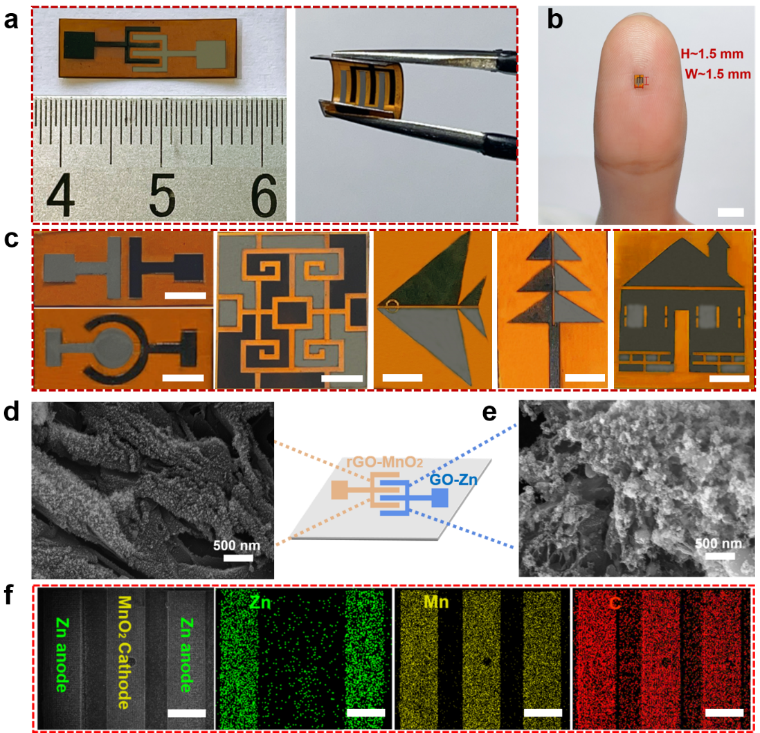单个微电池的总体尺寸约为0.6 cm2。观察到即使在弯曲状态下,微电池也能保持其结构完整性而不会从基材上脱落,显示出良好的柔韧性。由于激光的高精度,微电池的最小单位面积可达到~2.3 mm2 (~1.5 mm宽,~1.5 mm高),单个手指宽度和电极间隙仅为~160 µm和~100 µm。此外,它还可以实现任意几何形状的直接无掩模微图案制备。扫描电镜照片和mapping图像进一步证明了微电极的成功构筑。