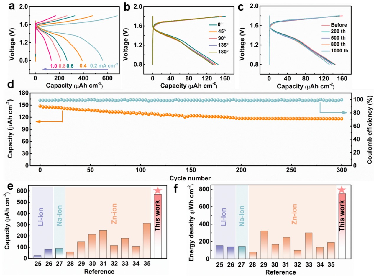 所构筑的Zn//MnO2微电池在电流密度为0.2 mA cm-2的容量高达0.57 mAh cm-2,能量密度0.75 mWh cm-2,性能优于大多数水系锌离子微电池以及锂/钠微电池。