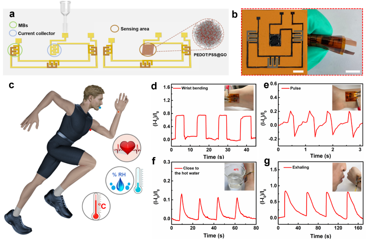 得益于全激光加工技术的可编辑性、非接触式和高效率的特点,可以快速在片上直接写入一种不需要外部电源的柔性多功能集成系统。该集成系统可以连续监测人体生理信号(应变、温度和湿度信号),以实现个性化医疗。