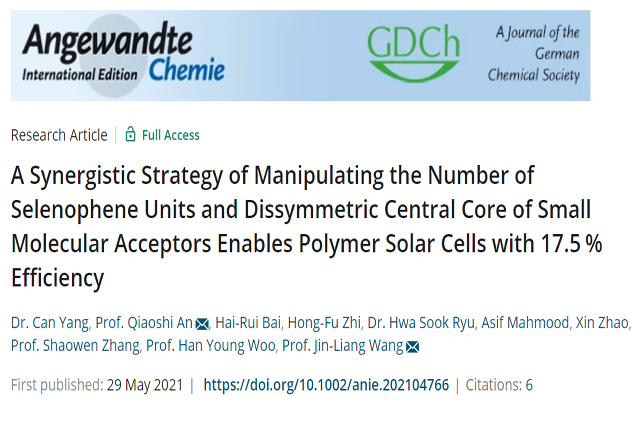 环境污染和能源危机是当今世界面临的两大难题,开发和利用高效率清洁能源是国家能源战略中亟需解决的重大科学问题。聚合物太阳能电池凭借其重量轻、机械柔性高、半透明、易于卷对卷印刷等优点,近年来在高效率清洁能源材料领域引起了广泛关注。非富勒烯小分子受体材料因能更好地吸收长波和优化的化学结构,增强了器件参数的平衡,从而显著提高了聚合物太阳能电池的光电转换效率。与噻吩类小分子受体材料相比,含有硒吩及其衍生物的受体材料经常表现出吸收光谱红移和电荷传输能力强的优点,使其在实现更高性能方面具有更多的可能性。但材料合成具有一定的挑战,此前基于高效率的硒吩类受体材料体系的研究报道相对较少。同时,如何通过解析分子化学结构、聚集形态特征(如单晶分子堆积和相分离)、理解其与宏观器件性能之间的关系,开发新型给受体材料,进而制备出高效率的聚合物太阳能电池,是目前科研人员一直关注和致力于解决的关键性科学问题。