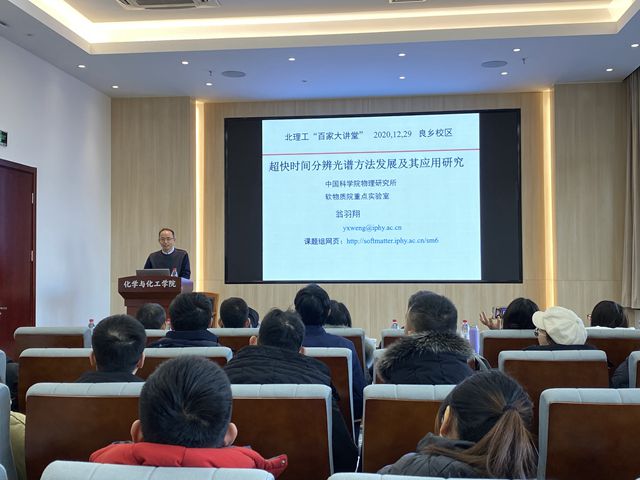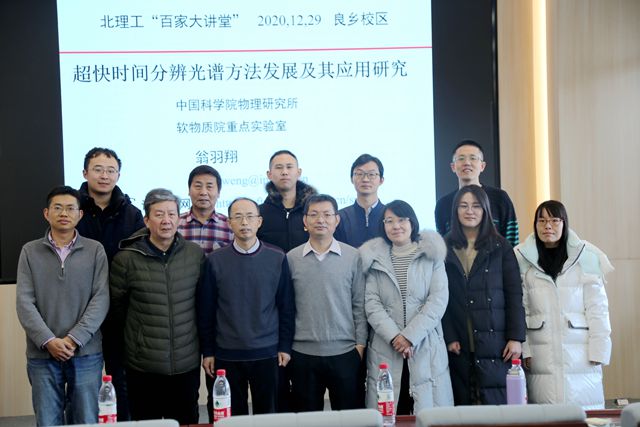 2021年12月29日上午,由北京理工大学研究生院主办、化学与化工学院承办的北理工“百家大讲堂”系列讲座在生态楼118会议室举行。中国科学院物理研究所软物质物理实验室翁羽翔研究员应化学与化工学院马嘉璧副教授的邀请,做了题为“超快时间分辨光谱方法发展及其应用研究”的学术报告。报告由张加涛院长主持,三十余名师生参加了报告会并进行学术交流。