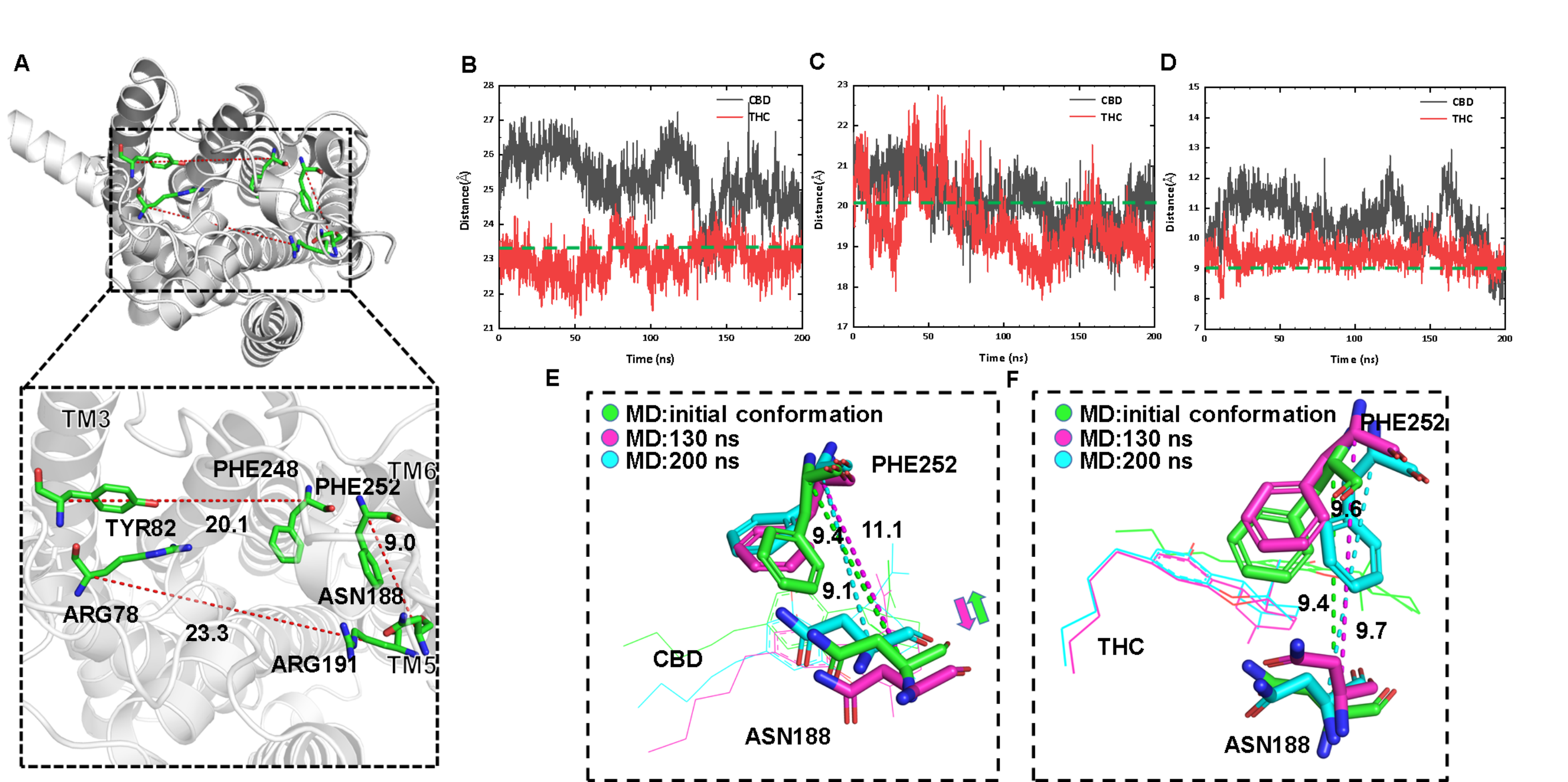 为了进一步探索大麻二酚与GPR18之间的具体作用模式,团队运用了诱导契合对接技术,并结合分子动力学模拟和拉伸分子动力学模拟等先进融合计算手段。诱导契合对接结果显示,大麻二酚与GPR18的结合亲和力低于四氢大麻酚,证实了GPR18的活性口袋不一定是部分激动剂的首选。分子动力学模拟进一步揭示了大麻二酚-GPR18复合物在200 ns期间的稳定构象变化,发现其可能通过改变活性口袋内关键残基的距离来触发GPR18的激活。与大麻二酚相比,四氢大麻酚作为完全激动剂,在与GPR18结合时展现出相对“亚稳态”的构象,说明可能形成了一种“收缩空间”,通过增加活性口袋的机械约束实现其完全激动作用。