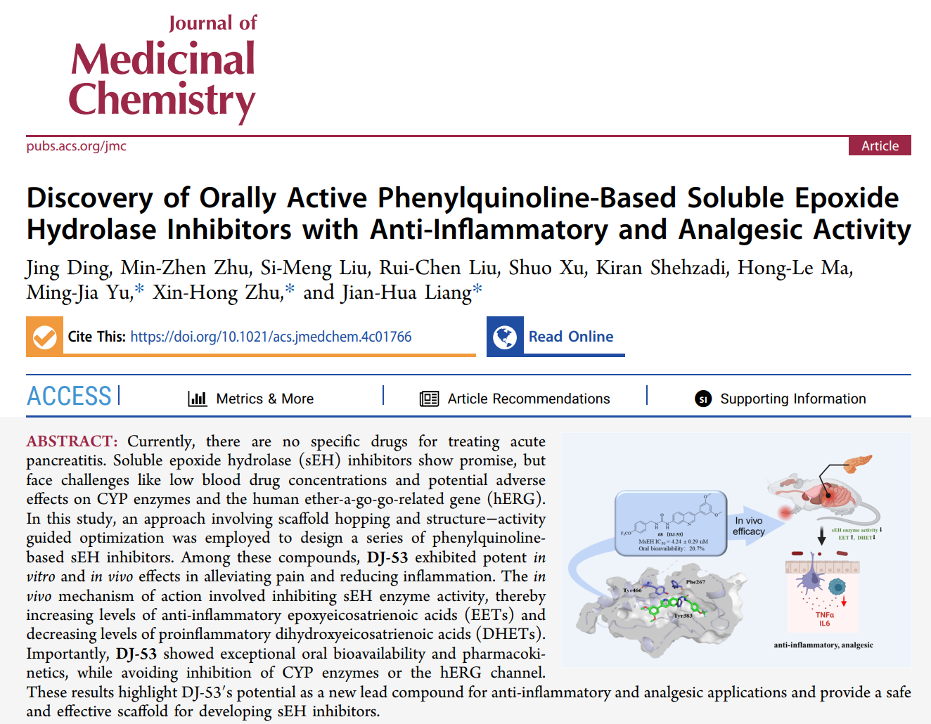 2024年10月5日,北京理工大学化学与化工学院医药分子科学与制剂工程工信部重点实验室梁建华教授课题组在胰腺炎治疗药物的研究中取得了重要进展。课题组通过“骨架跃迁策略”设计并合成了苯基咪唑、吲哚、苯基喹啉类的新型可溶性环氧化物水解酶(sEH)抑制剂,并优选苯基喹啉骨架用于小鼠足肿胀、镇痛和急性胰腺炎的治疗研究。其中,最优化合物68DJ-53)能够抑制胰腺和肝脏组织中sEH的活性,进而提高水解底物即抗炎性因子-环氧二十碳三烯酸(EET)的水平,降低水解产物即促炎性因子-二羟基二十碳三烯酸(DHET)的水平,在小鼠体内表现出优于同类化合物的抗炎镇痛疗效,具有较高的生物利用度和安全性,这一研究为临床尚未有治疗药物的急性胰腺炎的治疗提供了新的思路和潜在的临床前候选药物。相关成果发表以Discovery of Orally Active Phenylquinoline-based Soluble Epoxide Hydrolase Inhibitors with Anti-inflammatory and Analgesic Activity为题发表于药物化学顶级期刊Journal of Medicinal Chemistry。(文章链接: https://pubs.acs.org/doi/10.1021/acs.jmedchem.4c01766 )。