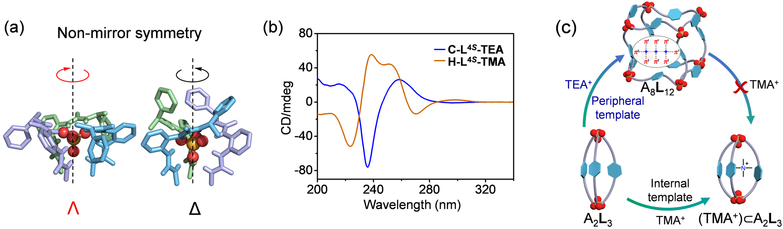 图4. (a)立方体C-L4S-TEA结构中两种配位构像非镜像对称,并且Δ-构象的螺旋性更强;(b)螺旋结构和立方体结构的圆二色信号;(c)模板客体调控的螺旋与立方体结构之间的转变。