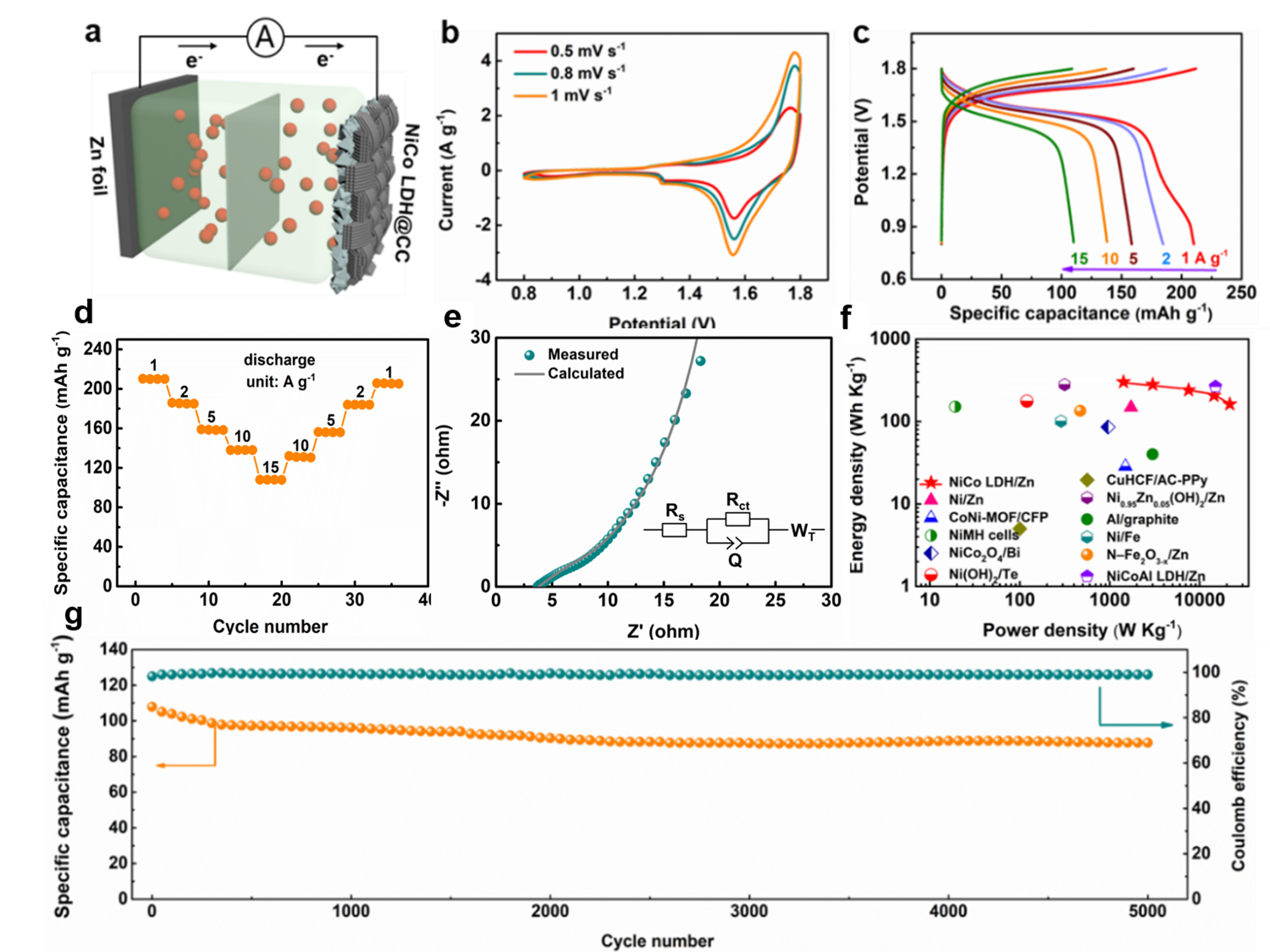 基于上述考虑,以NiCo LDH@CC为正极材料,Zn箔为负极材料,1.0 M KOH为电解液,研究了碱性水系锌电池的电化学性能(图5a )。图5b, c为电池的CV曲线和充放电曲线,根据充放电曲线所计算出电池在1.0 A g-1下的比容量为211.2 mAh g-1,在15 A g-1下电容保持在108 mAh g-1(图5d)。器件的奈奎斯特曲线如图5e所示,相应的等效电路如插图所示。图5f为与之前报道的大多数水系锌电池和其他水系储能器件的性能对比图,可以看出我们所组装的电池的能量密度具有较大优势。图5g为电池在15 A g-1下的循环性能图,在5000圈后能够保持81.4%的电容。
