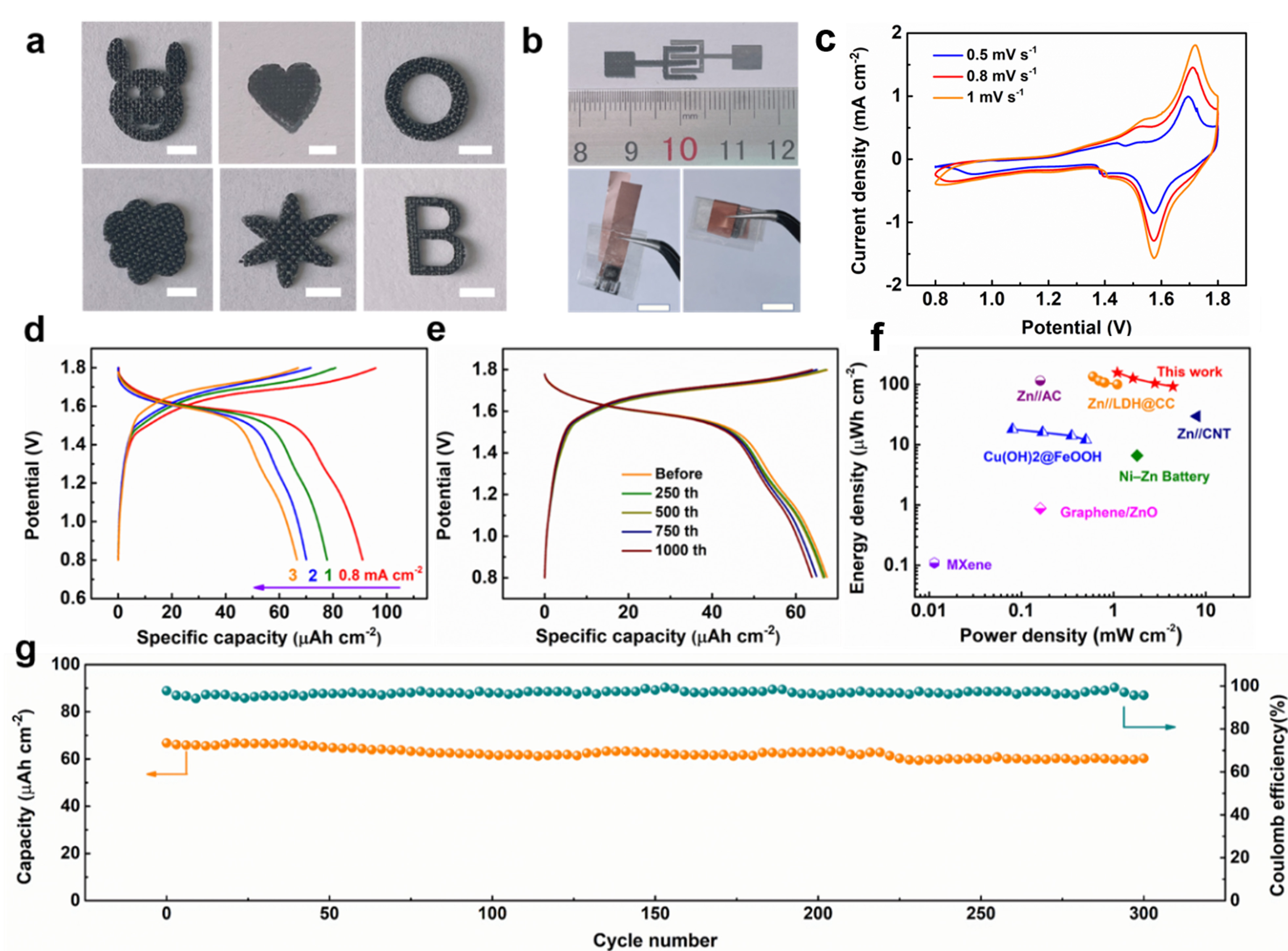 除了快速和大规模生产的优点外,制备的NiCoLDH@CC还显示出突出的机械稳定性、灵活性和可加工性,可任意切割成各种图案(图6a),显示出在下一代新兴能源设备中的潜力。例如,芯片上的微电源(例如,微型电池、微型超级电容器)由于其高能量密度和集成到微型设备的巨大可行性,近年来引起了极大的关注,这是智能医疗植入物、人工智能机器人和其他自供电微系统开发所必需的。为此,可以通过激光切割定制叉指电极图案。如图所示,6b,基于叉指式NiCo构建了柔性准固态片上碱性水性NiCo-Zn微电池(NC-ZMB,基于整个器件,面积约为0.6 cm-2)LDH@CC微电极、锌板微电极和PVA-KOH凝胶电解质。值得注意的是,NC-ZMB显示出显著的灵活性,如弯曲和旋转(图6b)。图6c-g为微电池的电化学性能图,其中最大面积比容量达到92µAh cm-2