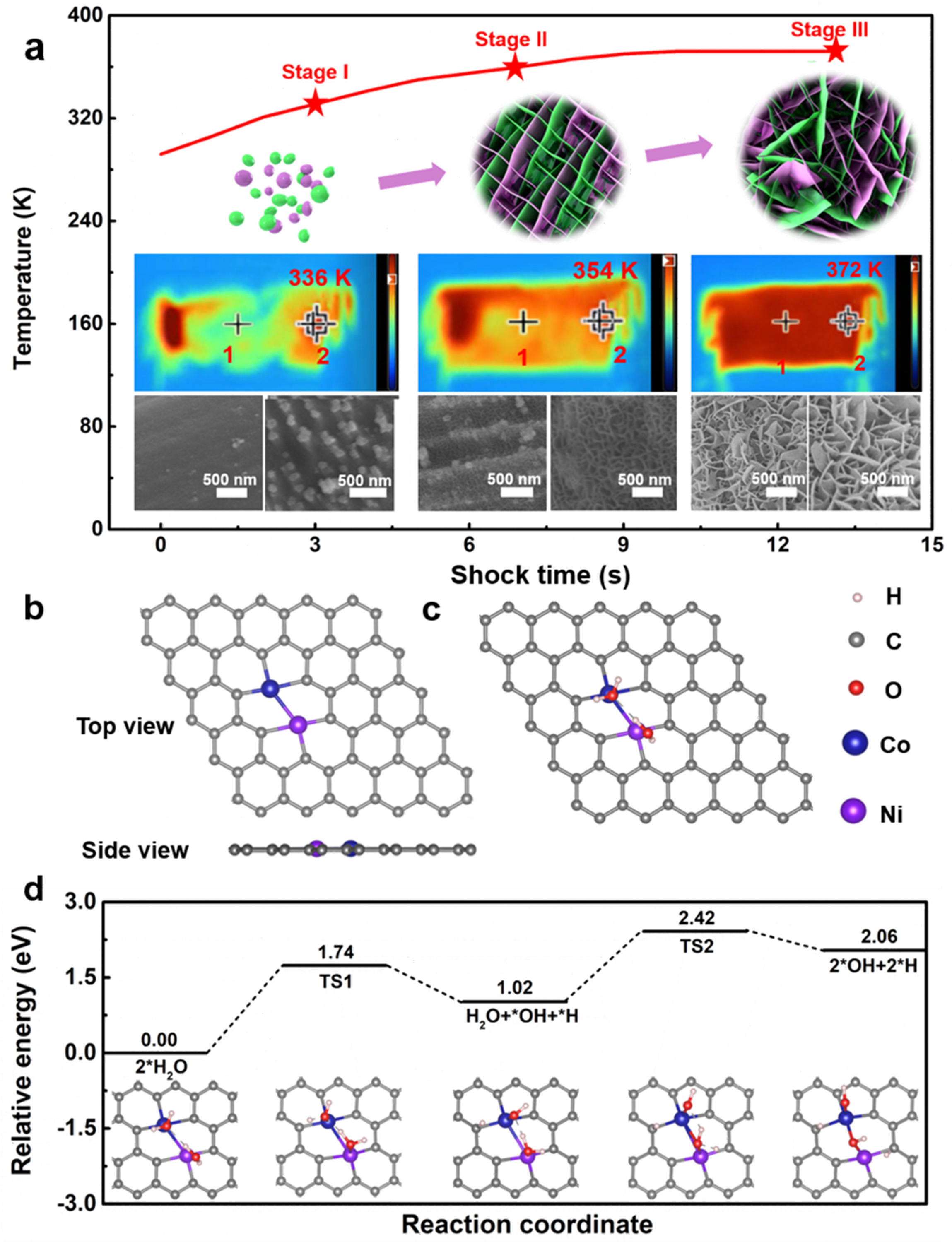 为了在分子水平上深入了解NiCo-LDH的形成机制,进行了DFT计算。NiCo LDH的形成被建模为H2O分子在嵌入石墨烯的Ni和Co金属中心的吸附,即NiCo/石墨烯(图3b),然后H2O分解生成NiCo(OH)2。H2O分子在NiCo/石墨烯上的结合在热力学上是有利的,计算的吸附能为-1.19 eV。然后,H2O分子在Ni和Co位点连续分解(图3c)。在Ni位点将H2O分解为Ni-OH和*H,上坡时为1.02eV,势垒为1.74 eV;并且在Co位点进一步分解H2O是1.04 eV,势垒为1.40 eV(图3d)。总的来说,H2O在NiCo/石墨烯上的分解是吸热的2.06 eV,势垒是2.42 eV,转换能量单位是232.68 kJ/mol。根据CC上NiCo-LDH的总负载(~92.87 g/mol)(1.0 mg/1.0 cm-2),在整个系统中打破反应1的能量势垒所需的能量约为15.0 J。此外,整个系统从293 K到372 K的温度变化如图3a所示。整个系统的加热过程约为13秒。这样,定性计算出热冲击产生的能量为~ 3900 J,一部分用于加热溶液,一部分用于反应。进一步,根据水分子的比热容,我们可以估算出溶液加热所需的能量约为3318 J,扣除溶液加热所需的能量后,剩余的~ 582 J远大于打破反应势垒所需的~ 15 J。基于以上考虑,整个合成过程的机理可以概括为热震法获得的大量能量可以打破整个反应的能垒从而驱动反应,最终在基体上生成目标相。而且由于溶液中碳布中心温度较高,反应动力学大大增强,反应时间急剧减少。