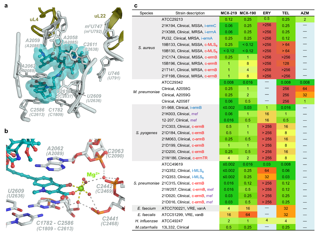 梁建华团队将大环内酯与喹诺酮通过特定的侧链连接,得到了作用于核糖体新位点C2586-C1782的新型大环内酯MCX-219和MCX-190,对各种耐药菌具有优异的抗菌活性,目前尚未有任何一种MLSB类抗生素报道作用该位点。经冷冻电镜解析复合物结构发现MCX-190与野生型和耐药型金黄色葡萄球菌核糖体均能产生稳定的结合,不受A2058是否受甲基化影响(图 a),喹诺酮骨架与核糖体A2062与C2586-C1782形成稳定的“三明治”结构,喹诺酮的酮酸结构与碱基磷酸骨架通过水和镁离子介导形成氢键(图b),该结构完全阻塞新生肽输出通道,因此对于组成型erm的金黄色葡萄球菌以及碱基突变的耐药支原体具有很好的抗菌活性。选取2021年在全国收集的不同种类耐药菌进行抗菌活性测试验证了化合物的高活性(图c)。化合物在原核细胞比在真核细胞抑制蛋白质翻译具有高选择性,比泰利霉素呈现更优的体外抗菌活性,覆盖耐药病原菌广,且具有病原菌细胞累积高,人源细胞毒性低,血药和肺部组织浓度高的优点。