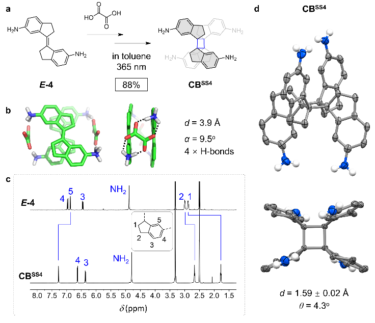 氨基官能团修饰的刚性二苯乙烯配体4则可以在草酸根阴离子模板下高效转化为四氨基取代的环丁烷分子(图3),通过单晶结构、紫外光谱、核磁和质谱进行了系统的表征。氨基官能团修饰的刚性二苯乙烯配体制备简单且易于合成后修饰。