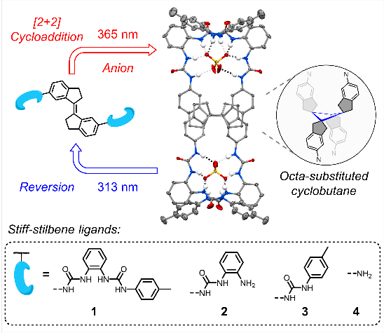 为解决上述问题,在前期建立的阴离子配位驱动组装合成策略(Acc. Chem. Res. 2022, 55, 3218-3229; Angew. Chem. Int. Ed. 2023, 62, e202314510; Angew. Chem. Int. Ed. 2024, 63, e202406946)研究基础之上,吴彪教授团队首次利用刚性二苯乙烯(stiff-stilbene)的[2+2]环加成反应实现了一系列八取代环丁烷衍生物的高效合成。刚性二苯乙烯是一类明星光开关分子,得益于其差异性的几何结构、高效的异构化行为、合成易修饰的特点,在离子识别与传输、分子马达和超分子聚合物等领域应用广泛。然而,尚未有研究报道其能够发生[2+2]环加成反应。
