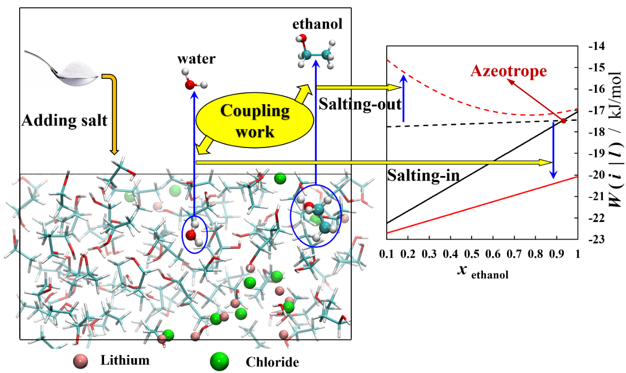 研究团队将以上的理论研究结论和计算方法应用于化工精馏过程中经常遇到的最高共沸物和最低共沸物的体系,同样获得了很好的结果,解释了共沸现象发生的过程和机理(图3)。另外,通过对加盐精馏过程的模拟,也解释了加入物质分离剂后的盐析和盐溶效应。这部分的工作发表在《Chemical Engineering Science》(https://doi.org/10.1016/j.ces.2023.118751,影响因子:4.7,2区Top),李弥异为第一作者和通讯作者,刘贺磊教授同为通讯作者。