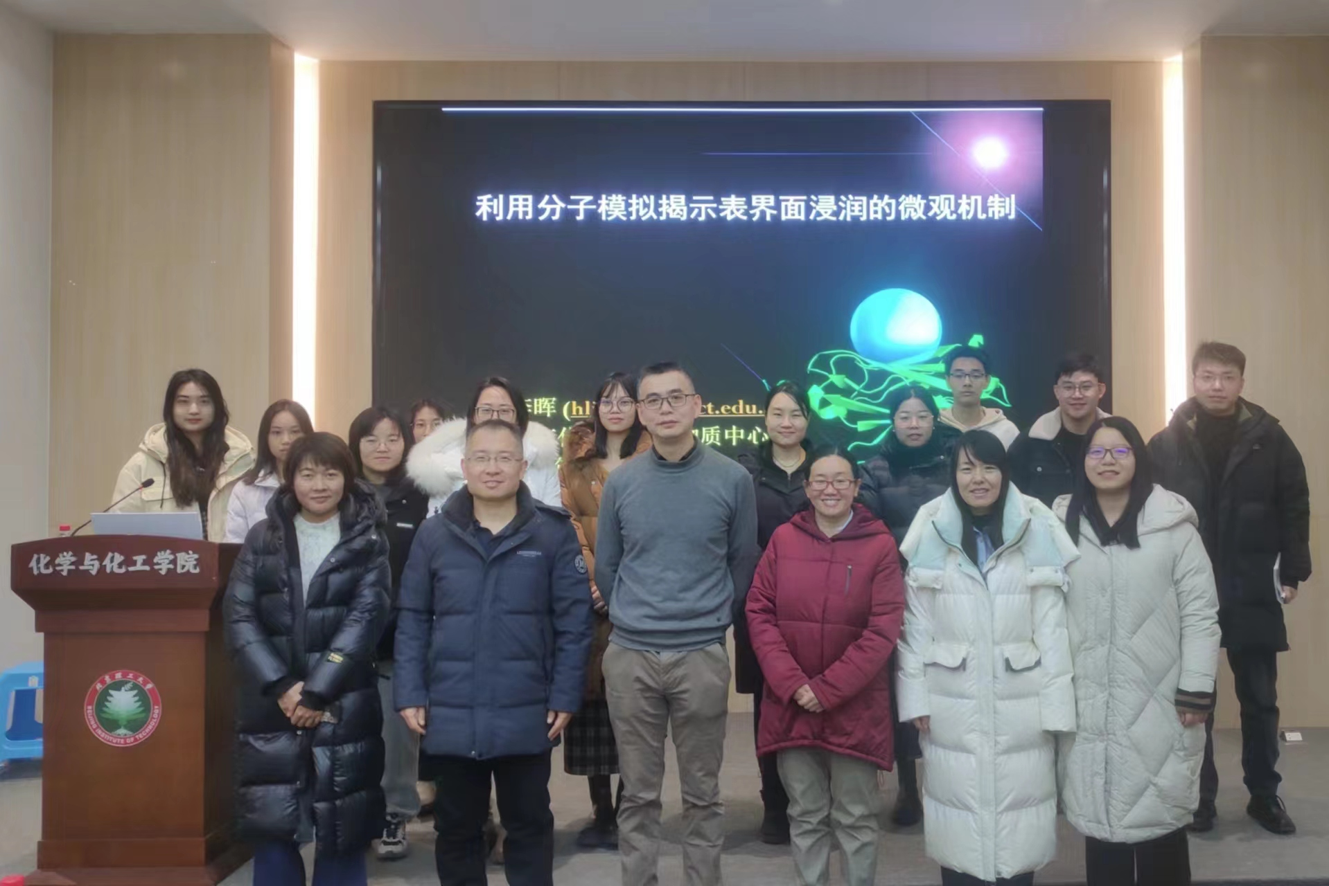 2023年12月4日上午10点,由北京理工大学研究生院主办,化学与化工学院承办的“21世纪学科前沿”系列学术讲座于工业生态楼118会议室举行。东华大学闻瑾研究员和北京化工大学李晖教授到访我院并作题目分别为“外场调控超快动力学的理论研究”和“用分子模拟揭示表界面浸润的微观机制”的精彩学术报告。三十余名师生参加了本次讲座。