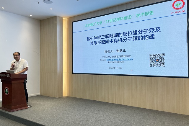 应北京理工大学化学与化工学院邀请,广州大学大湾区环境研究院谢廷正教授于2023年7月7日做客北理工“21世纪学科前沿”系列论坛,为我院广大师生带来题为“基于咪唑三联吡啶的配位超分子笼及其限域空间中有机分子笼的构建”的精彩学术报告。本次报告在生态楼118报告厅进行,由姚燎原老师主持,近六十名化院师生参加了报告。