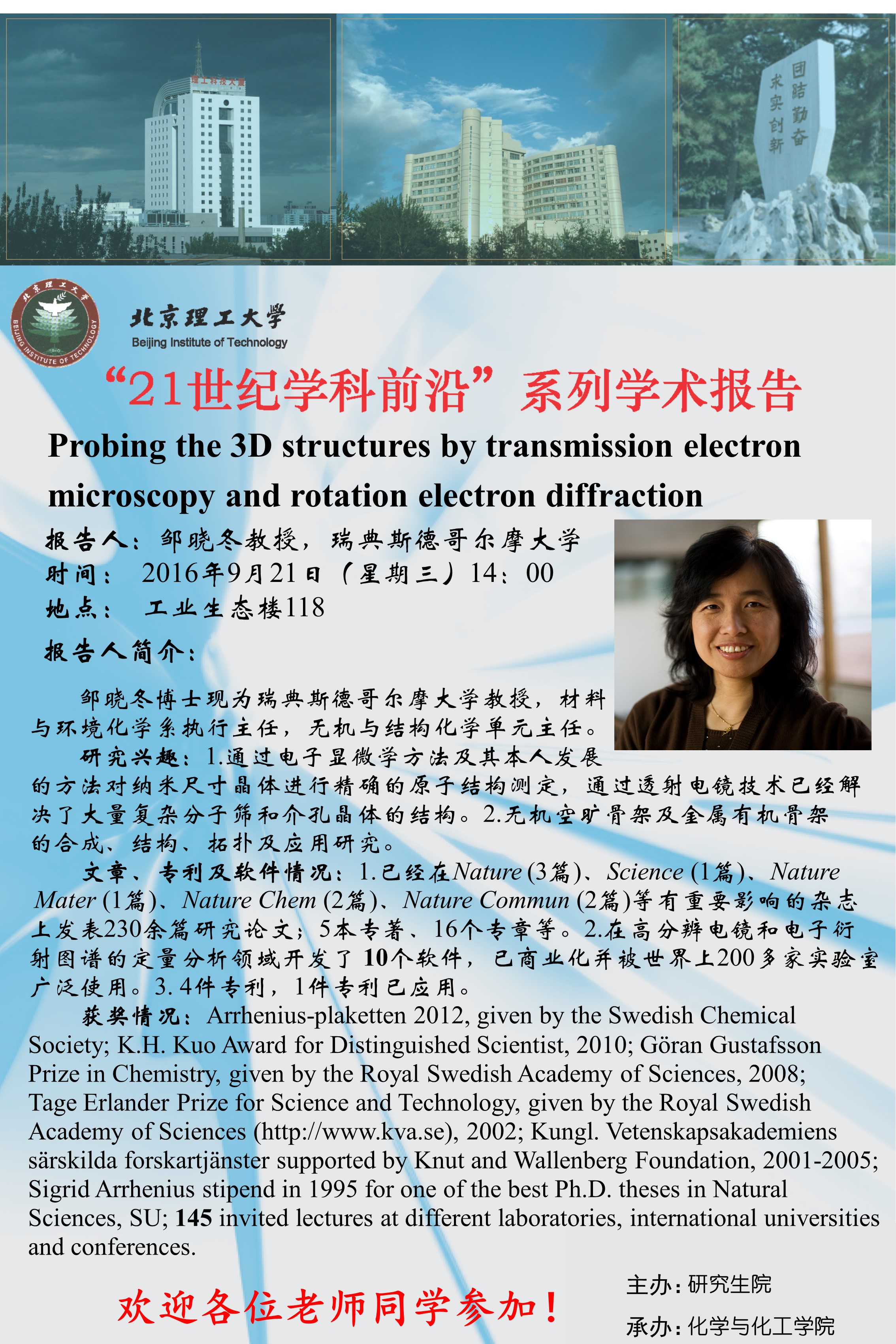 【化学与化工学院】“21世纪学科前沿”邹晓冬教授学术报告通知