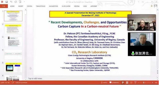 首先,张加涛院长对于Paitoon Tontiwachwuthikul院士做客百家大讲堂表示了热烈的欢迎,同时向Paitoon Tontiwachwuthikul院士介绍了北京理工大学及我校化学与化工学院在“碳中和”领域的前瞻部署和长远规划。