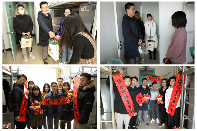 慰问期间,张锋与留校学生进行了亲切交流,仔细询问同学们近期的科研任务、食堂伙食、宿舍温度等方面是否存在困难,并鼓励同学们积极参与学院开展的“记忆中的年味”“年味正当时”“教师陪你看春晚”“疫情防控及安全检查志愿者”等各类线上线下活动,读一本书,适度参加体育运动,丰富自己假期生活的同时,在北京理工大学化学与化工学院这个大家庭度过一个有收获、有成长、有意义的中国传统佳节。