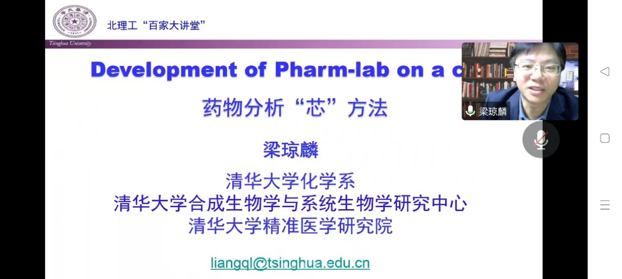 2022年10月15日上午,由北京理工大学研究生院主办,化学与化工学院承办的北理工“百家大讲堂”系列讲座在腾讯会议线上举行。应化学与化工学院王蔚芝老师的邀请,清华大学梁琼麟教授做了题为“Development of Pharm-lab on achip(药物分析“芯”方法)”的学术报告。四十余名师生参加了报告会并进行学术交流。