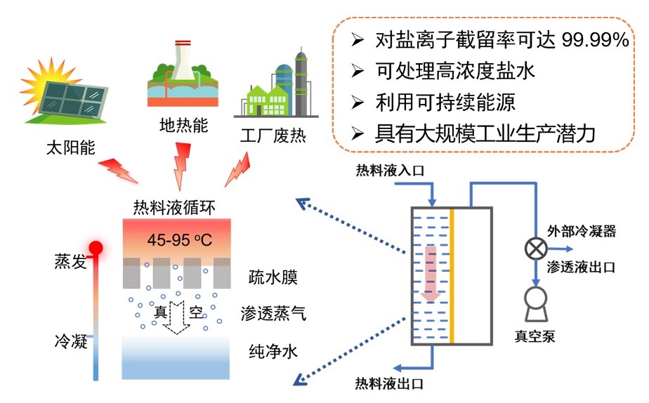 膜蒸馏(MD)技术利用膜两侧蒸汽压力差为传质驱动力并通过热驱动使得水蒸气穿过多孔的疏水膜材料进行脱盐。膜蒸馏是膜技术与低温挥发技术相结合的产物,综合了反渗透和蒸馏技术的优点,可实现对溶液中盐离子接近100%的去除,在处理高浓度、高污染盐水和利用工业废热等低品位热以及太阳能、地热能方面具有巨大优势。此外,MD脱盐系统相比于传统热脱盐工艺(MED和MSF)设备简单、操作简便,具有构成大规模生产体系的灵活性。因此,MD作为一种可持续的、低能耗的海水淡化技术在诸多海水淡化工程中具有一定竞争力与应用前景。然而,传统聚合物疏水MD膜通量低且面临严重的膜污染和膜浸润等问题,严重限制了膜蒸馏技术的进一步发展。