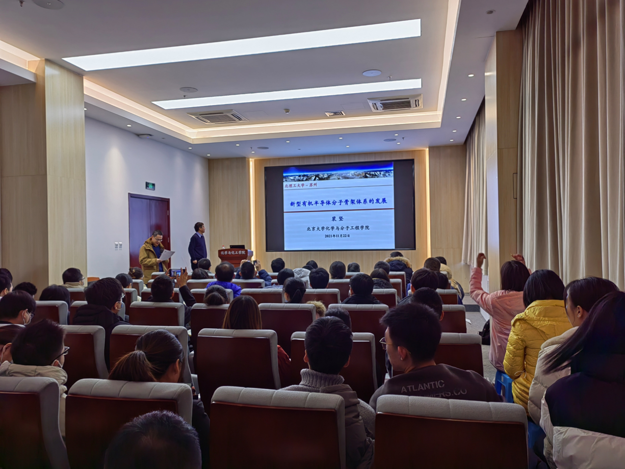2021年11月22日上午,由北京理工大学研究生院主办、化学与化工学院承办的北理工“百家大讲堂”系列讲座在工业生态楼118报告厅举行。北京大学化学与分子工学院裴坚教授受邀作题为“新型有机半导体分子骨架体系的发展”的学术报告。来自化学与化工学院的部分研究生、求是书院和特立书院的部分本科生以及化学与化工学院的陶军教授、张小玲教授、金旭辉教授、杜大明教授、吴彪教授、王金亮教授、安桥石特别研究员等共计100余名师生参加了本次报告会。本次报告会由化学与化工学院副院长陶军教授主持。