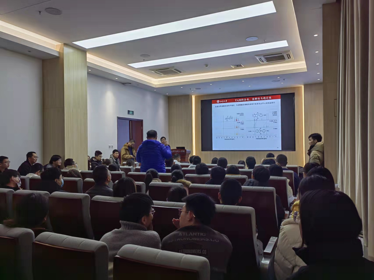 裴坚教授在报告过程中深入浅出,生动有趣,极具感染力,将高大上的材料设计思路和基础有机化学教材相结合,深受广大师生的喜爱和欢迎,也激发了在场的本科生同学对有机化学等基础化学课程的热爱和兴趣!