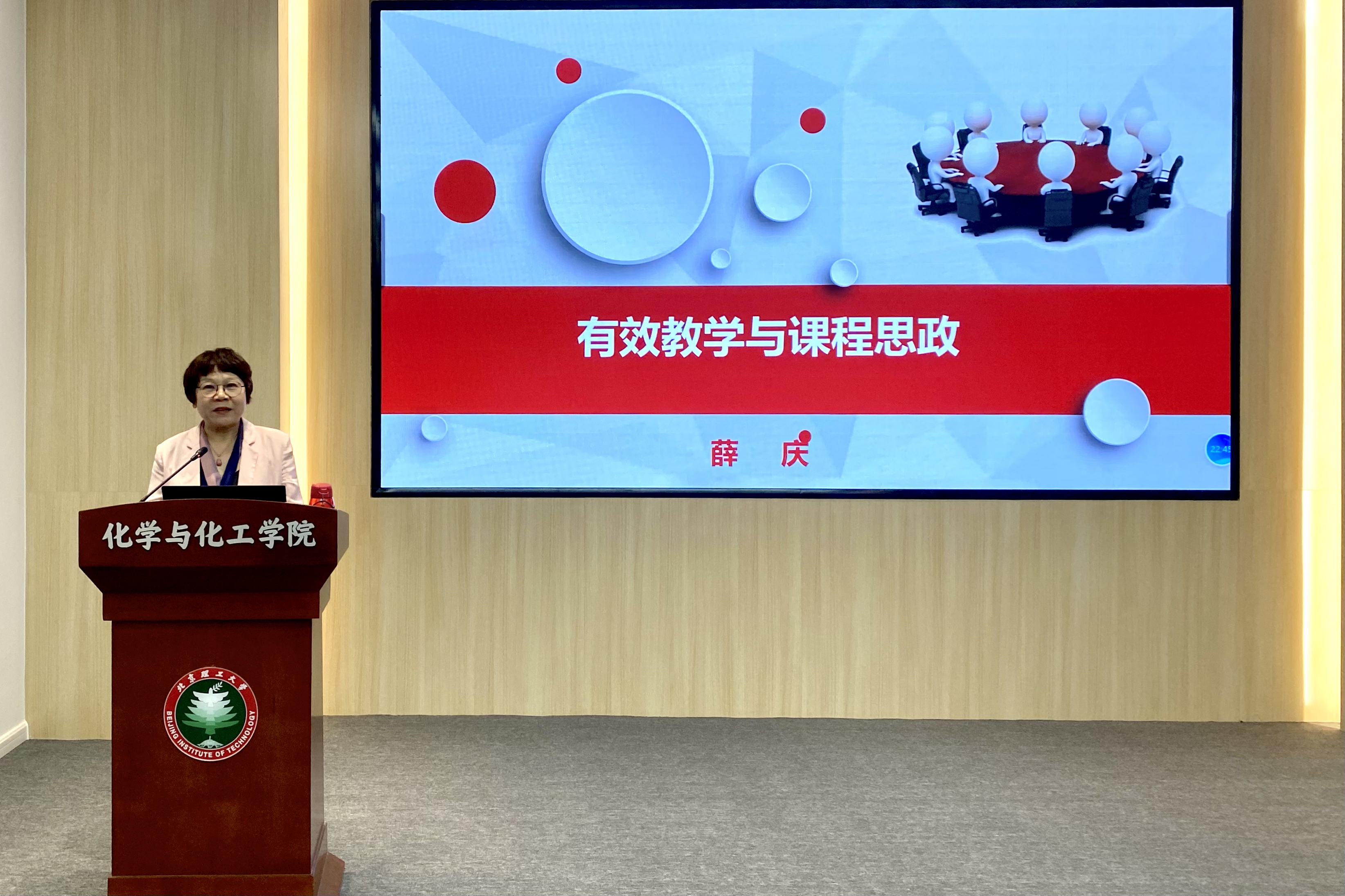 2021年6月22日化学与化工学院举办“聆听师道”系列活动,邀请全国模范教师,北京市高等教育教学名师,国家级优秀教学团队核心成员薛庆教授做有效教学与课程思政专题讲座。讲座线上、线下同步进行,50余名教师参加,由副院长支俊格主持。