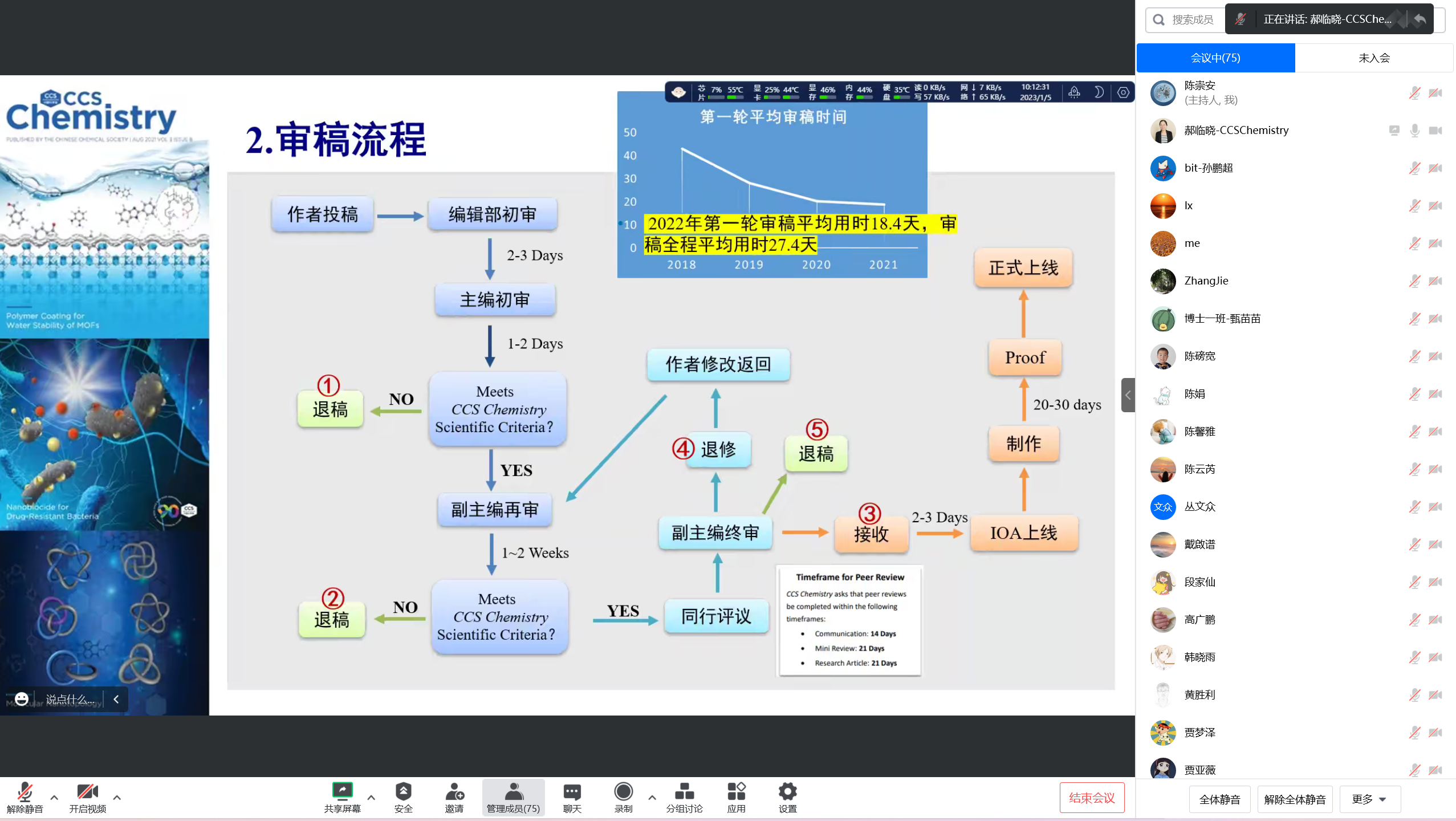 郝临晓博士首先向广大师生介绍了CCS Chemistry的基本情况与期刊定位,接着重点介绍了期刊的审稿流程,审稿关注,审稿反馈以及其他投稿审稿等常见问题,帮助广大师生更清楚了解CCS Chemistry期刊从投稿到发表的各个流程,同时也给广大师生提供了文章写作中的注意事项。