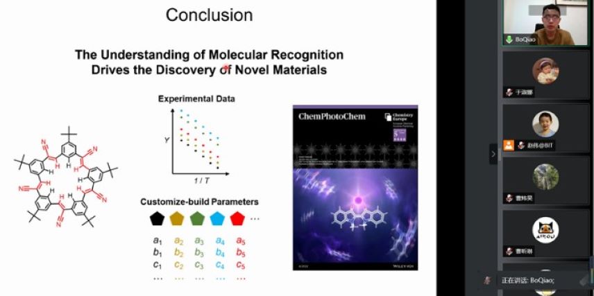 2022年6月24日下午,上海科技大学物质科学与技术学院乔博教授应邀到北理工开展线上交流,并作题为“非共价相互作用调控分子光开关”的学术报告,化学与化工学院四十余名教师和学生参加了此次交流。