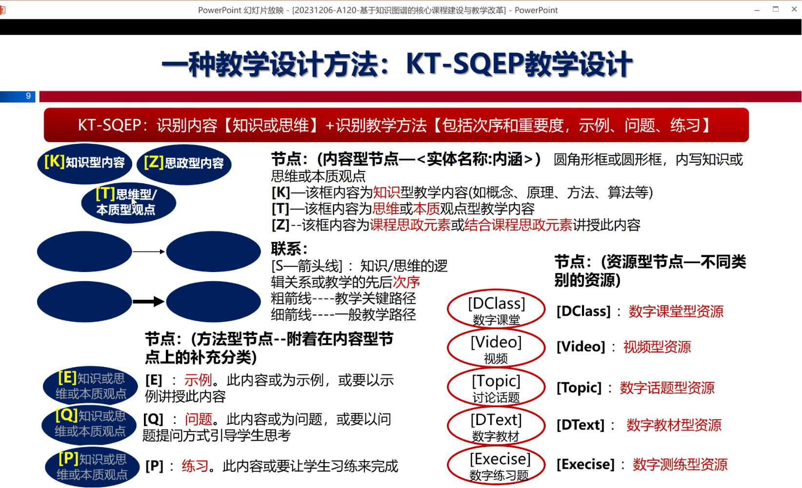 战老师在报告中对知识图谱的概念进行了详细解释。知识图谱是以“图”的形式描述现实/虚拟世界中的知识及其相互关系的一种方法,是知识体系的一种表达方法,其基本组成形式为,<节点,边,节点>的三元组。提出了KT-SQEP教学设计。教学设计主要包括教学方法设计,教学内容设计,教学活动设计,学时分配设计,线上线下结合设计以及考核评价设计,其中教学方法设计和教学内容设计是实施教学的前提。教学内容设计涉及到内容型节点,包括知识型内容[K],思维型或本质型观点[T]以及思政型内容[Z]。教学方法设计包括次序和重要度、示例、问题、练习等,S为箭头线,指的是知识/思维的逻辑关系或教学的先后次序,E为示例,以示例讲授内容,Q为问题,以提问方式引导学生思考,P为练习,让学生练习完成。战老师还介绍了知识图谱对未来教育模式的影响。教学创新需要有高水平的教学设计,其解决方案为理念创新及教学创新,教学设计要有系统性整体性有理念有特色,才能呈现出好的教学成果。