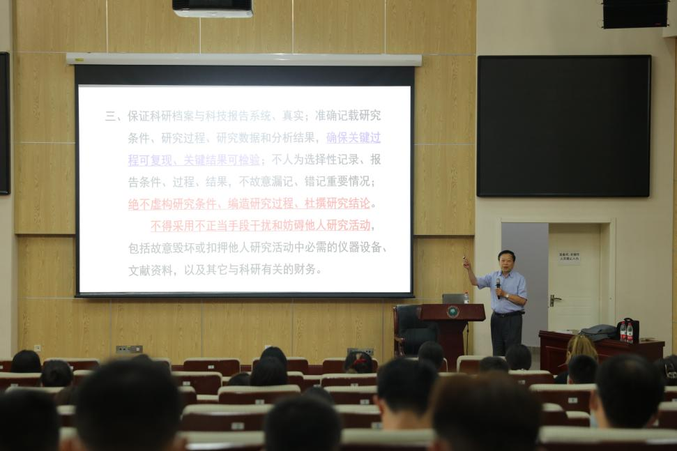 大会首先由胡长文教授做了以《学术道德规范与科研诚信》为主题的报告。他以国务院、中央军委以及北京理工大学对于学术道德方面的规范、建议展开,告诫同学们要对待科研要实事求是,注重科研诚信,在发表论文专利等科学著作时严格按照行业规范及准则。