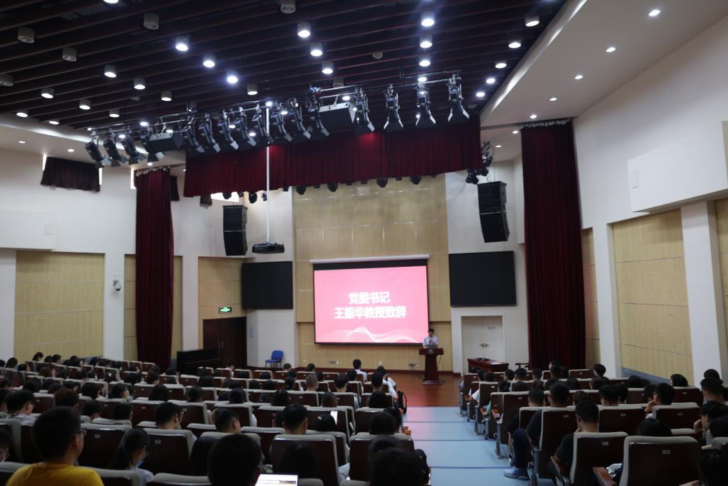 开学典礼在庄严的国歌声中拉开了序幕。学院党委书记王振华教授首先致辞,他对来自全国各地的297名优秀学子表达热烈欢迎的同时,对新同学们也提出了四点希冀——“把爱国当作立身之本,把理想当作成才之基,把知识当作成长之石,把奋斗当作最亮底色”,他希望同学们置身于中华民族伟大复兴战略全局和世界百年未有之大变局,能够在化学与化工学院所搭建的圆梦舞台上,展开自己的翅膀,书写自己的篇章,在未来实现个人理想的同时,给中华民族伟大复兴画上浓墨重彩的一笔。